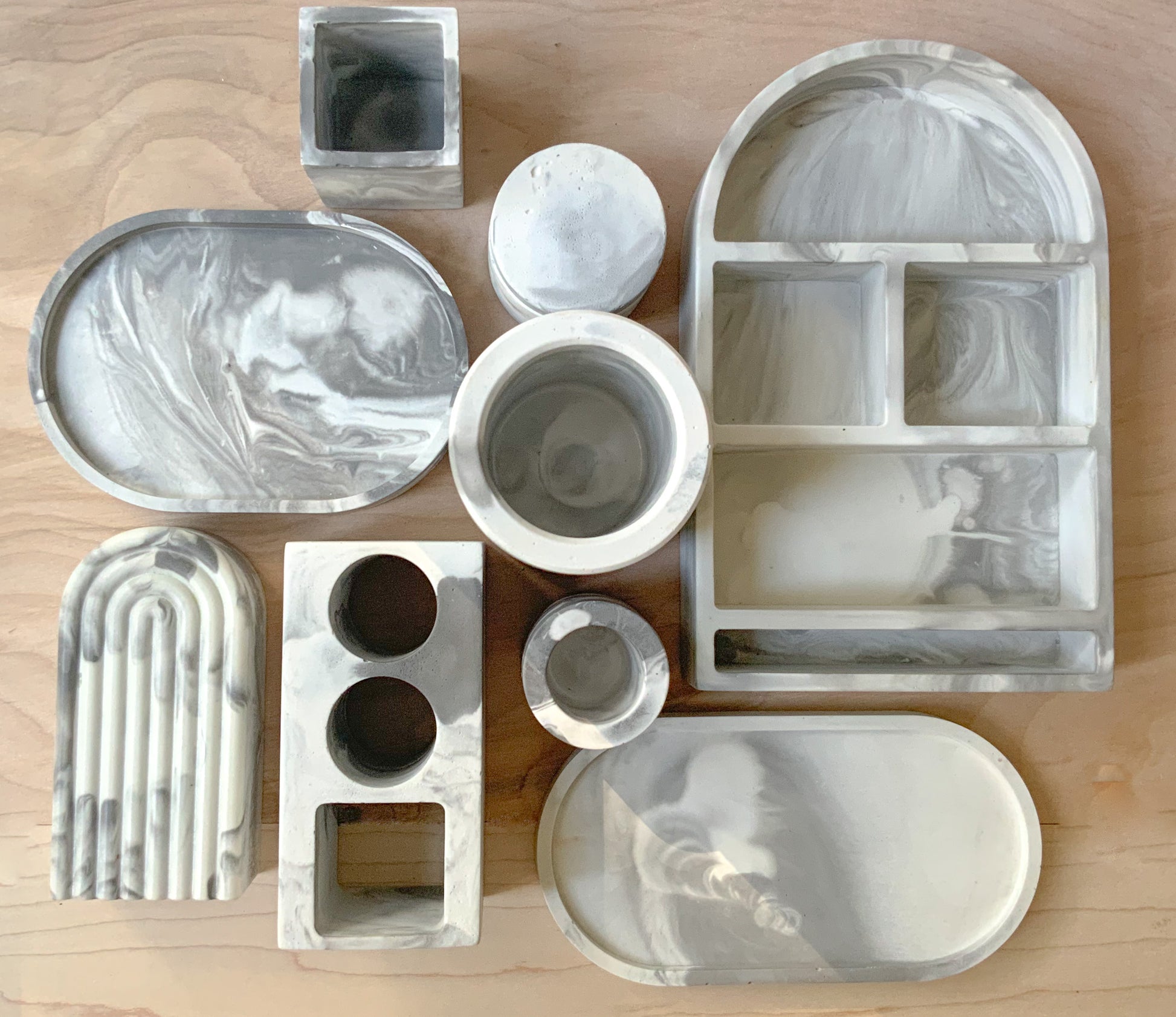 Materials: These are handmade with gypsum cement, an eco-friendly sealer, and rubber pads. Gypsum cement is similar to Jesmonite, or eco-resin and is smooth, hard, and a strong surface with high water absorption resistance. Dry, the strength of our material is 10,000 psi in comparison to most concretes which vary from 2500-4000 psi. Imagine the durability of this stone is much like that of your favorite ceramic mug.