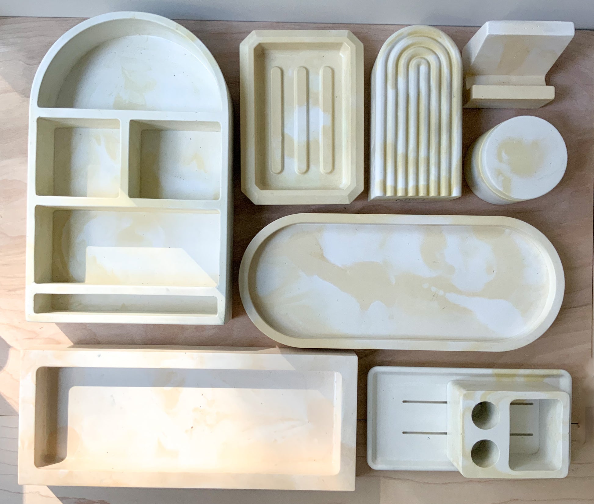 Modern Tray and bathroom accessory organizer set. This set includes the tray and toothbrush organizer. (find more items like the storage cup and more for additional accessories)