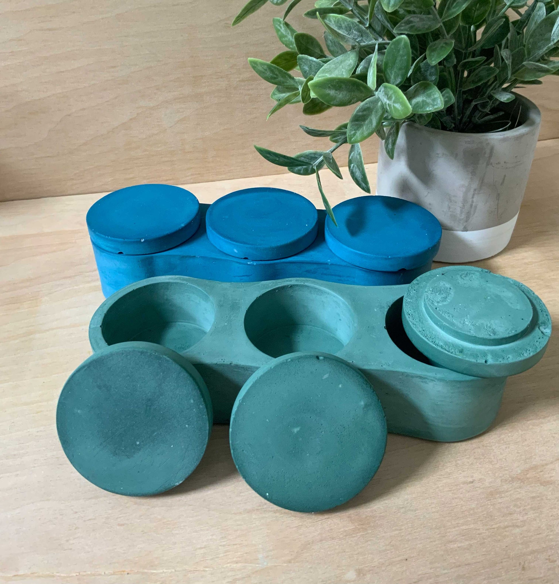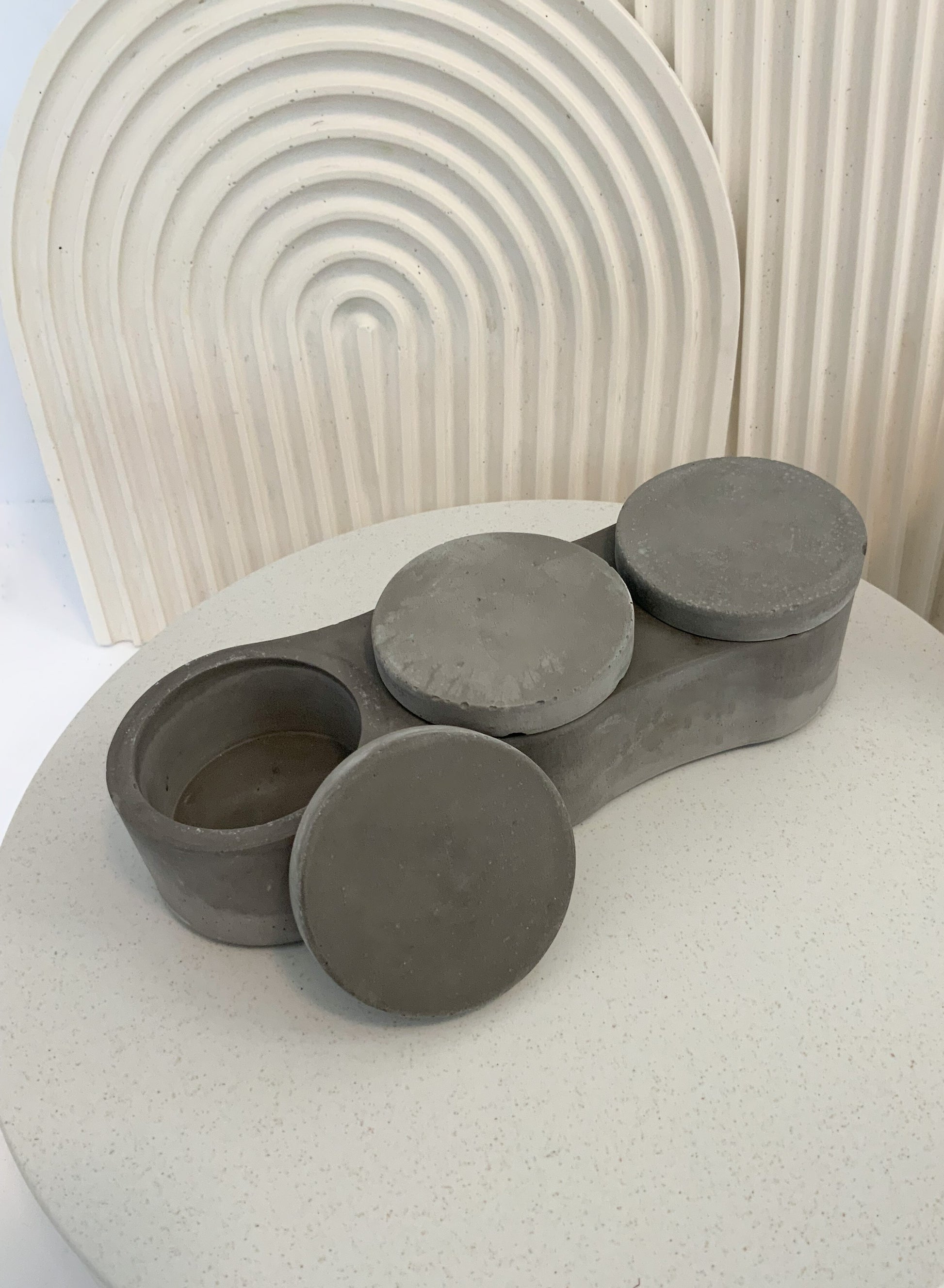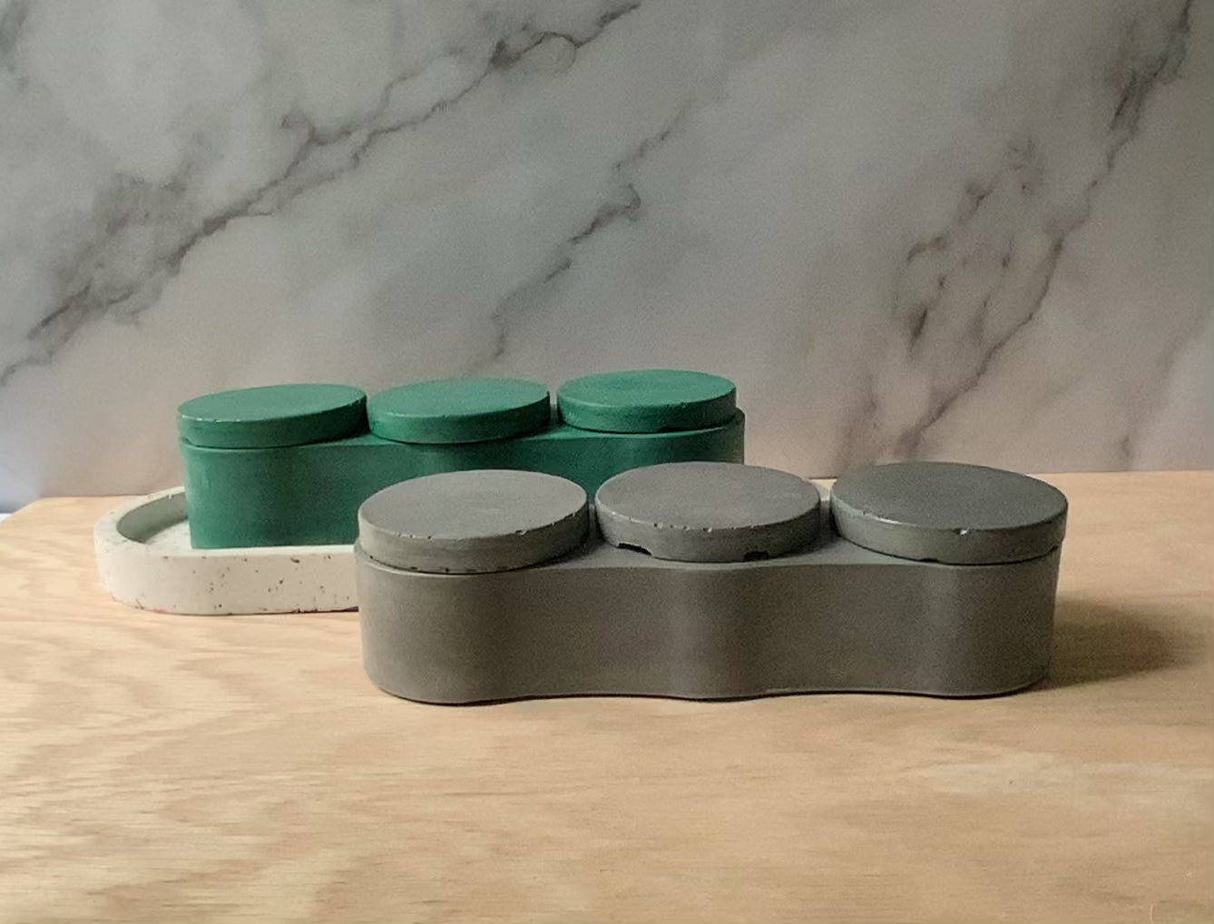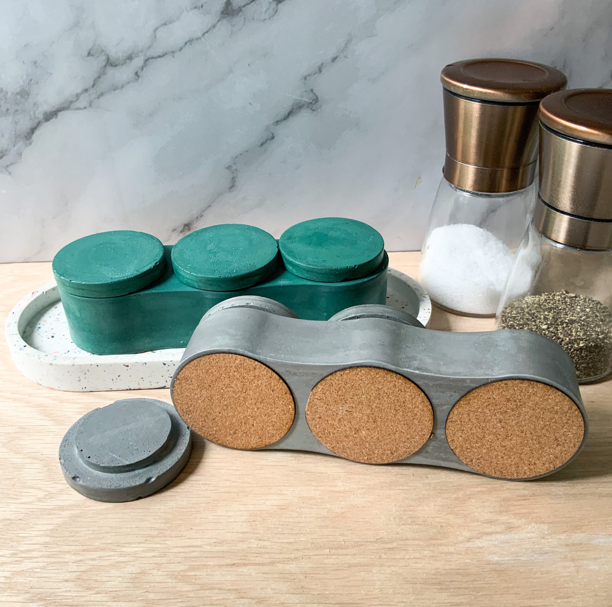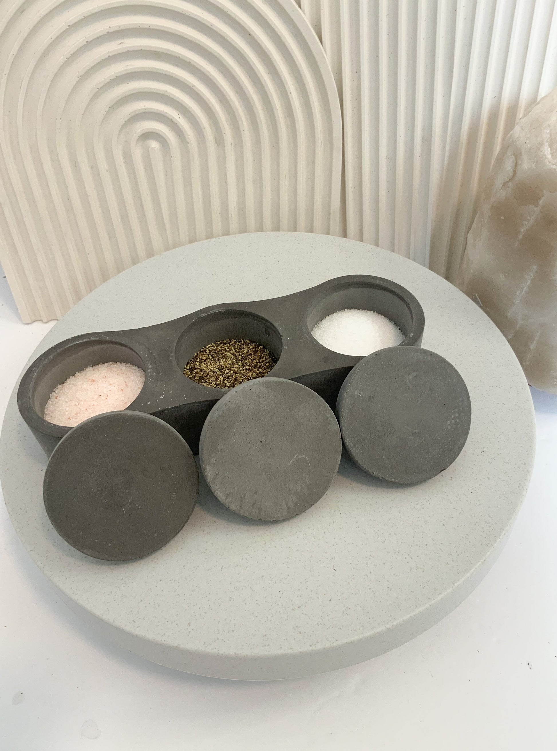 This stylish gypsum concrete vessel set stores any spices, salt, pepper, sugar or anything you'd like. There are three pots for storage with lids. It can also be used for jewelry storage, in the bathroom, or in the office.