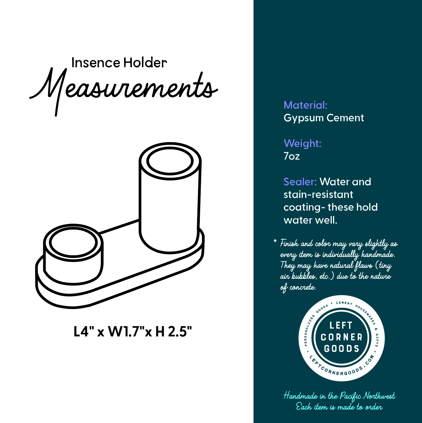 Materials: These are handmade with gypsum cement, and an eco-friendly sealer. Gypsum cement is similar to Jesmonite, or eco-resin and is smooth, hard, and a strong surface with high water absorption resistance. Dry, the strength of our material is 10,000 psi in comparison to most concretes which vary from 2500-4000 psi. Imagine the durability of this stone is much like that of your favorite ceramic mug.