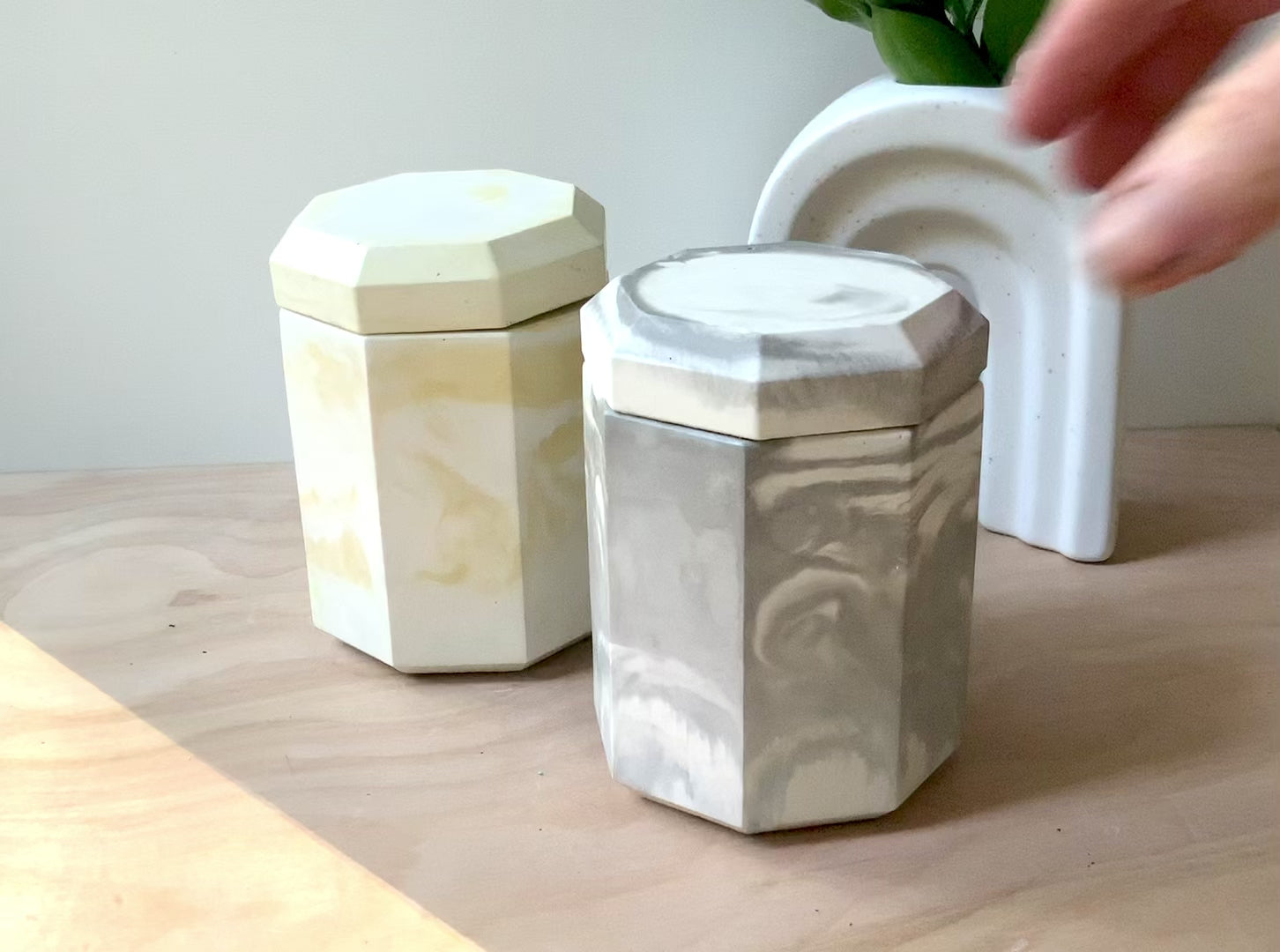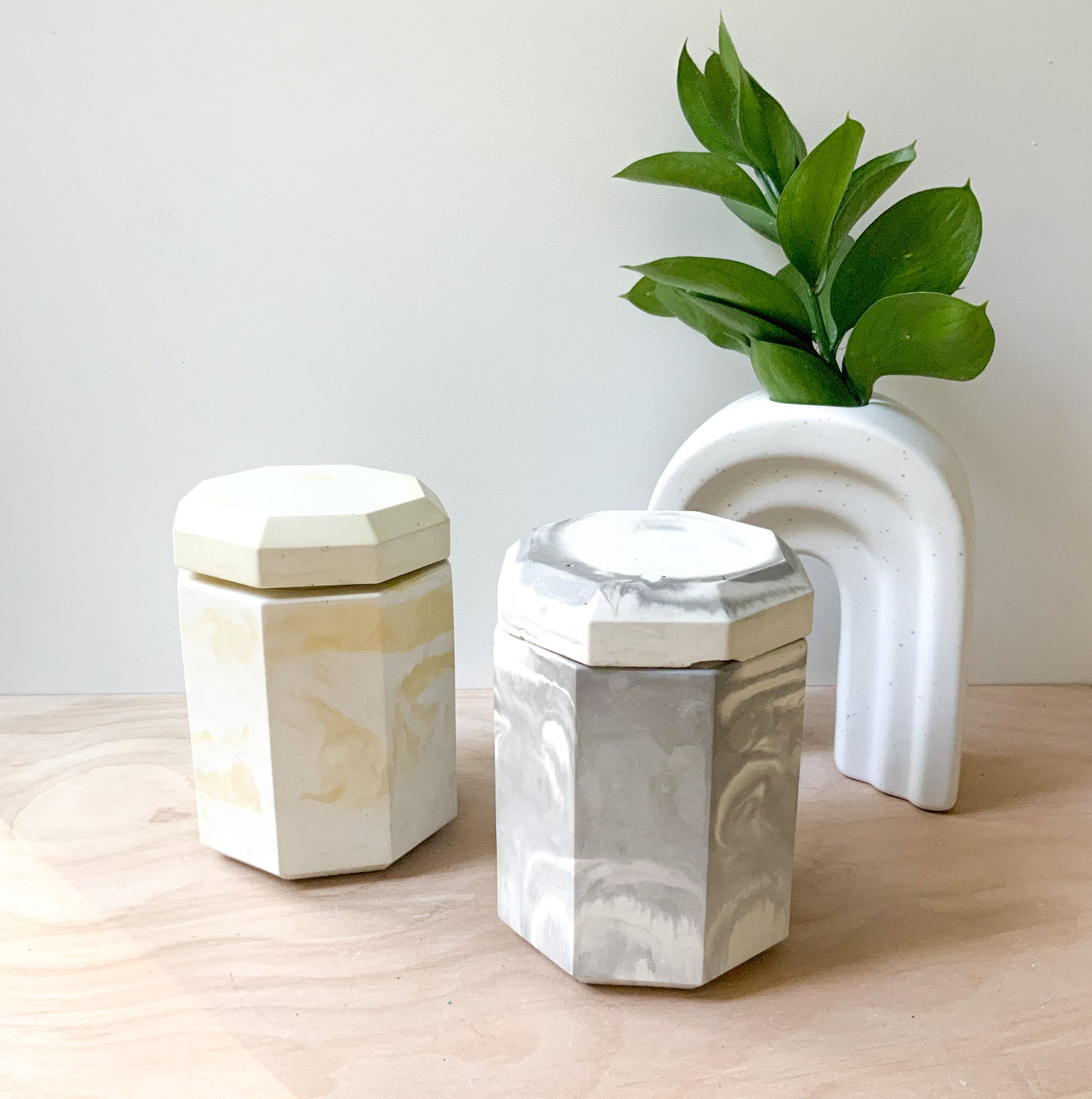 This stone hexagon storage container with a lid is modern, matte and silky feeling and will add style to any style of decor wether you prefer modern minimalist style, industrial touches, or are more eclectic or boho. Use in your bathroom for cotton balls, face pads, q-tips, or add to your desk for storage. Use in the kitchen to store tea, or whatever you please.