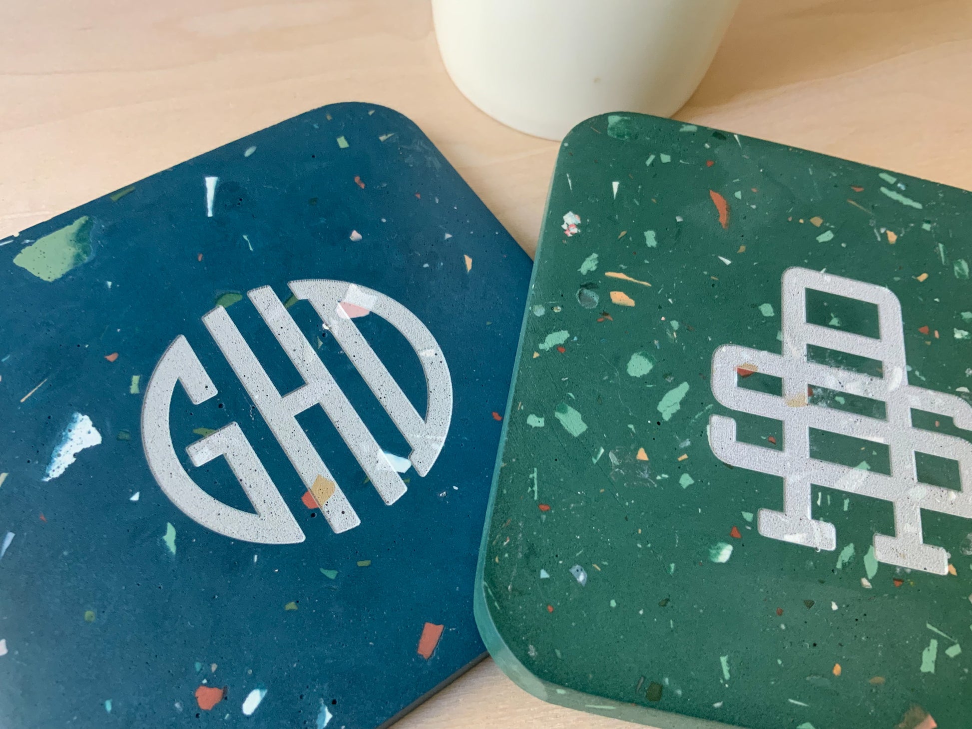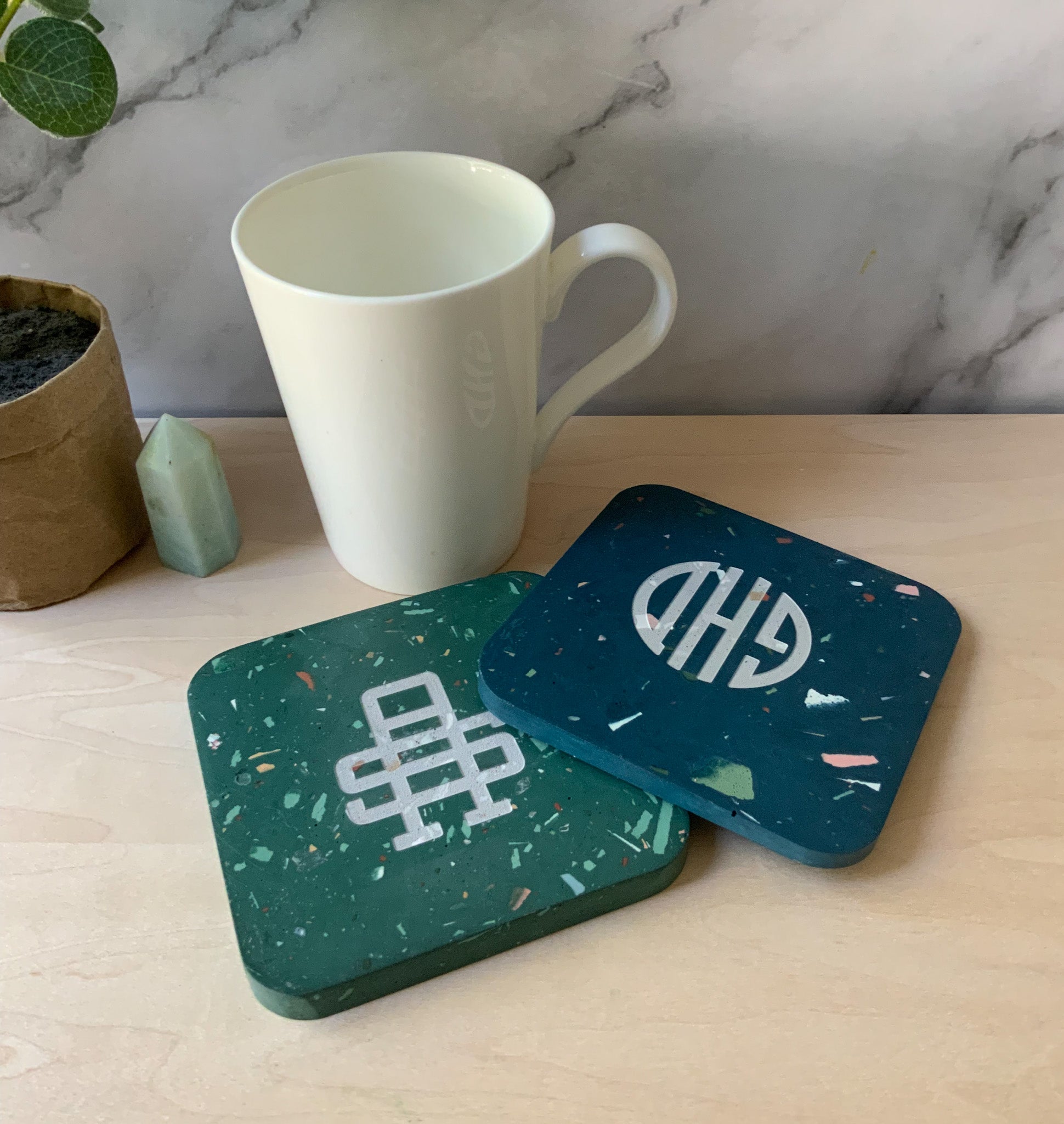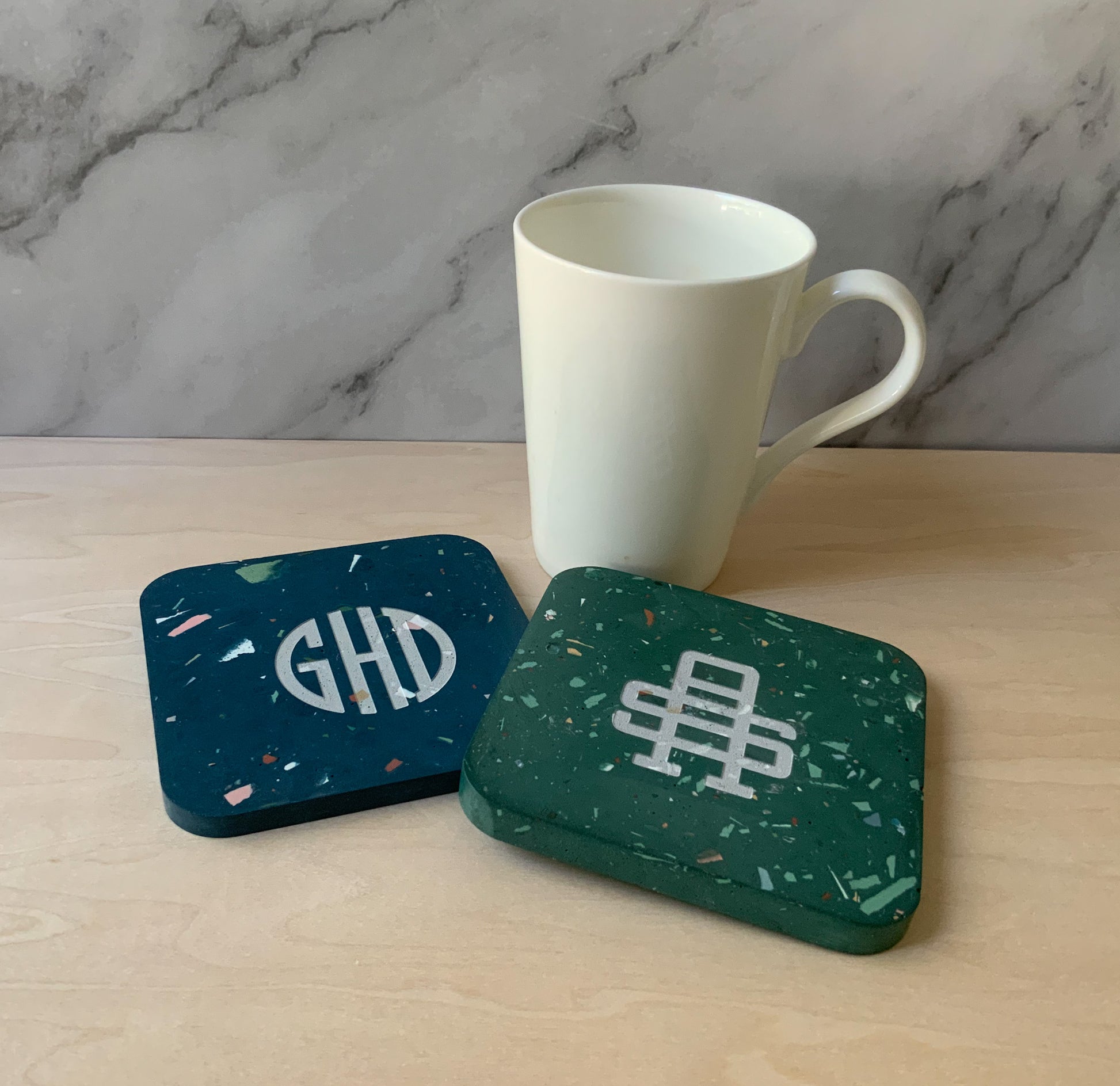 Materials: These are handmade with gypsum cement, an eco-friendly sealer, and rubber pads. Gypsum cement is similar to Jesmonite, or eco-resin and is smooth, hard, and a strong surface with high water absorption resistance. Dry, the strength of our material is 10,000 psi in comparison to most concretes which vary from 2500-4000 psi. Imagine the durability of this stone is much like that of your favorite ceramic mug.