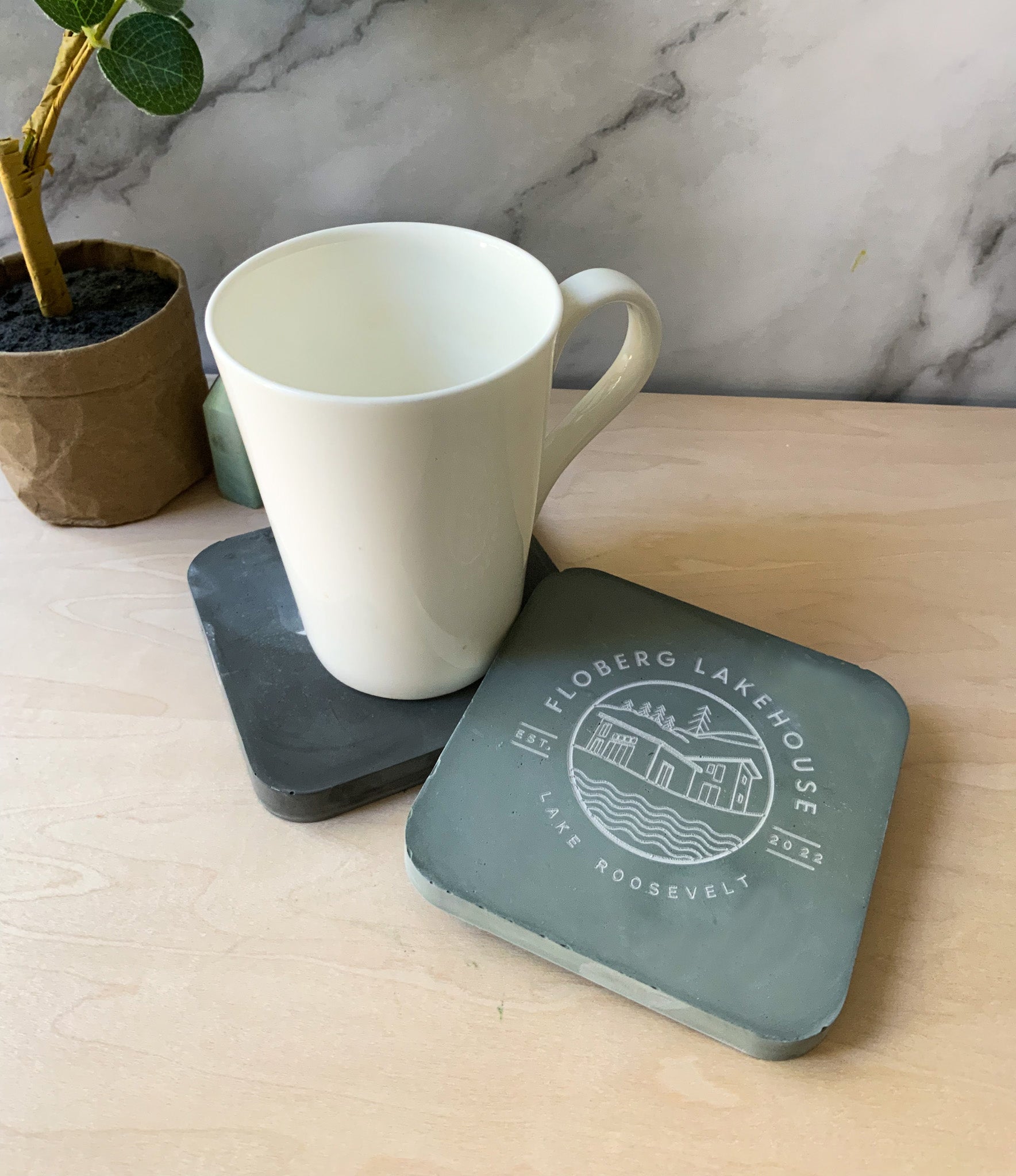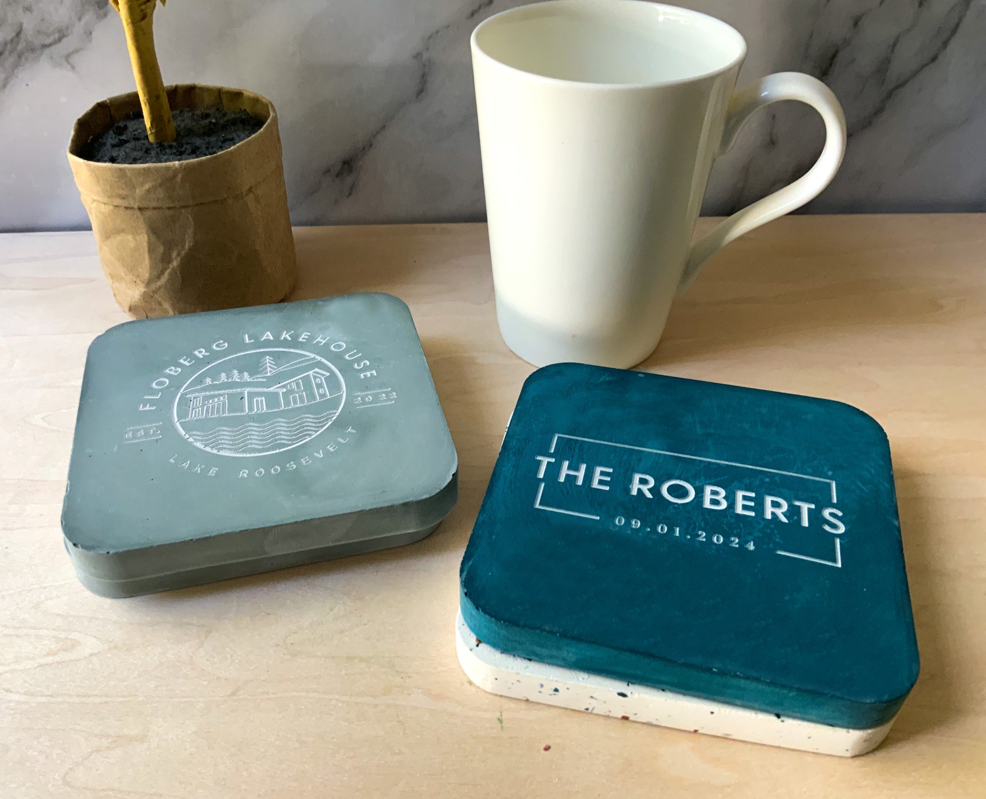 Materials: These are handmade with gypsum cement, an eco-friendly sealer, and rubber pads. Gypsum cement is similar to Jesmonite, or eco-resin and is smooth, hard, and a strong surface with high water absorption resistance. Dry, the strength of our material is 10,000 psi in comparison to most concrete which varies from 2500-4000 psi. Imagine the durability of this stone is much like that of your favorite ceramic mug.
