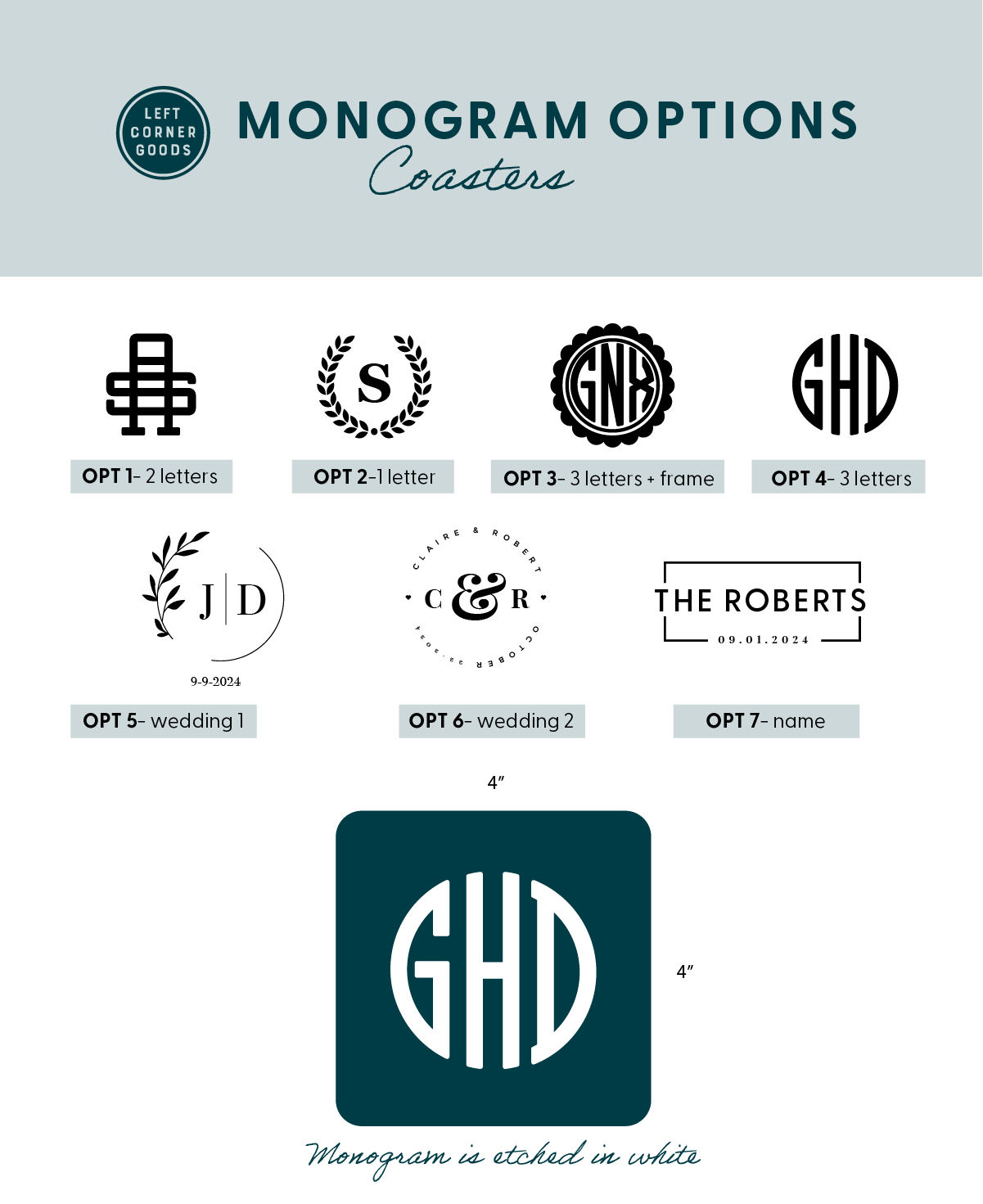 This coaster set of 4 will add a mid-century modern touch while protecting surfaces around your home or office. Add a custom logo, monogram (see options) or text. The customization is laser etched in white. They are sealed to prevent staining, simply wipe off any stains.