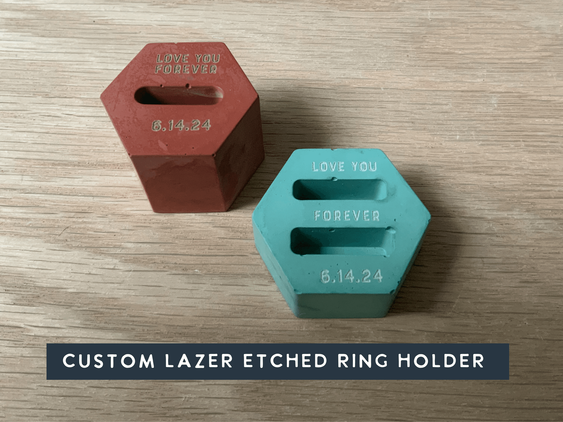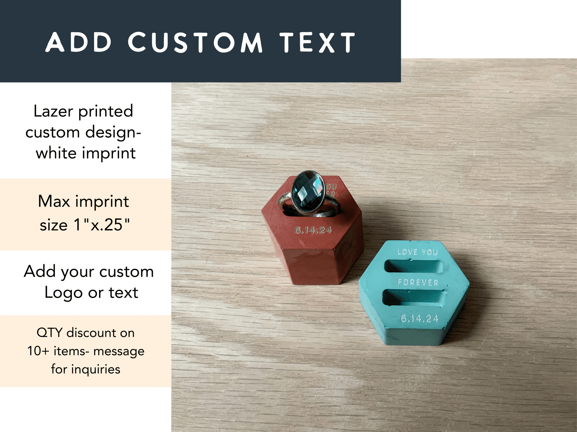 This listing includes custom text, or your logo laser etched on the top of the hexagon ring holder. Please send your custom text in the notes of your order to holly@leftcornerdesign.com - you will receive a proof of your text or logo on your piece before production.
