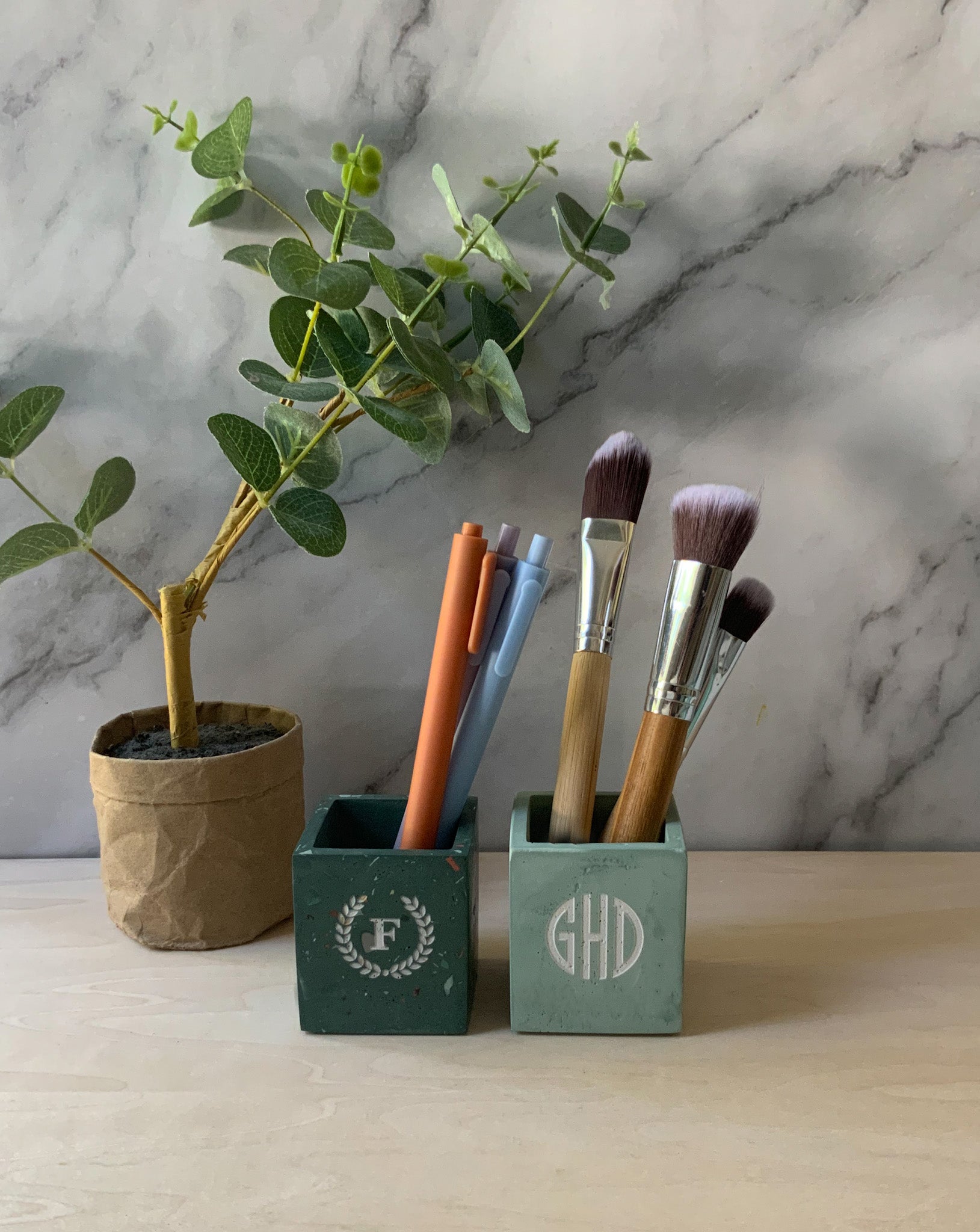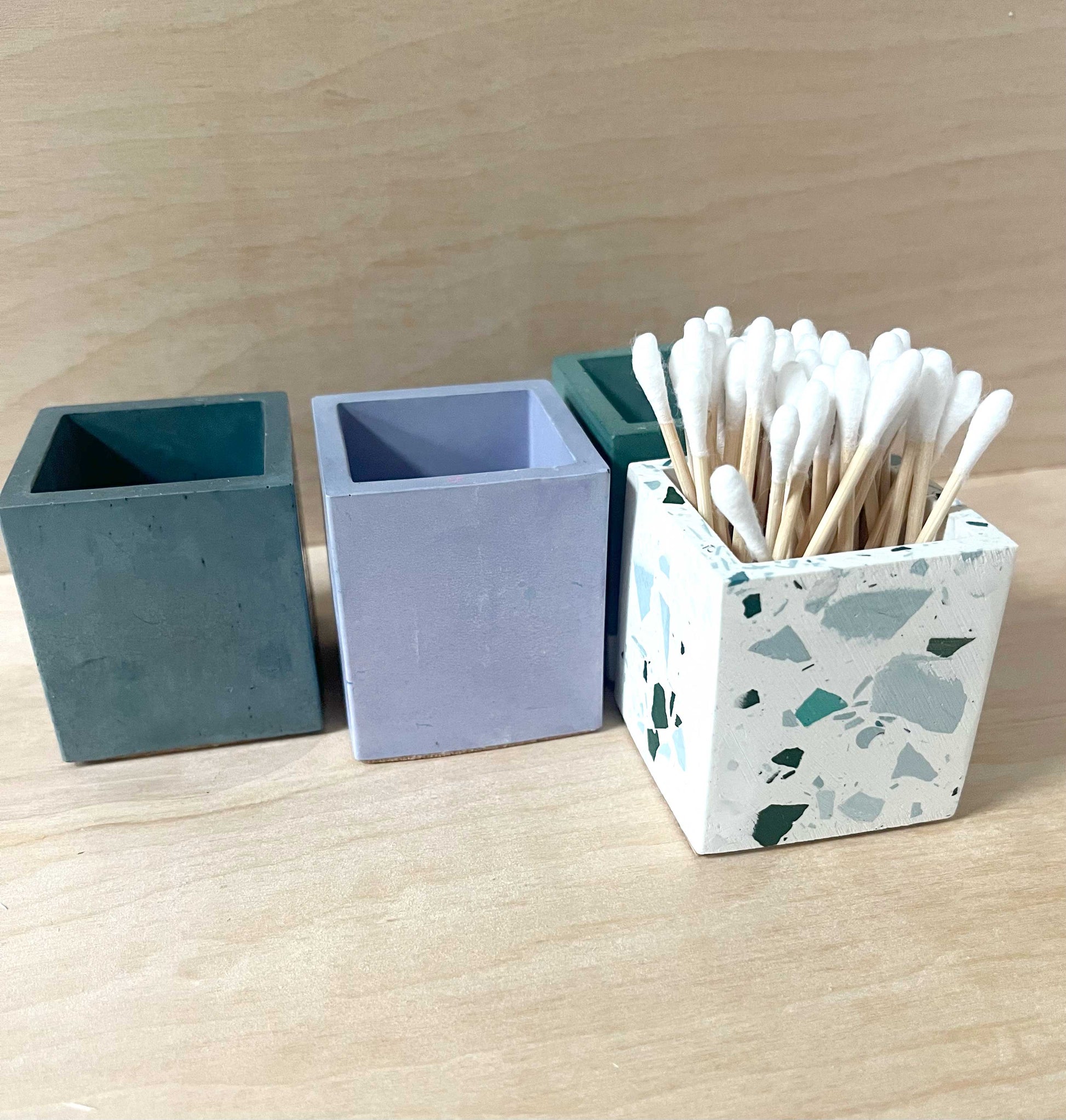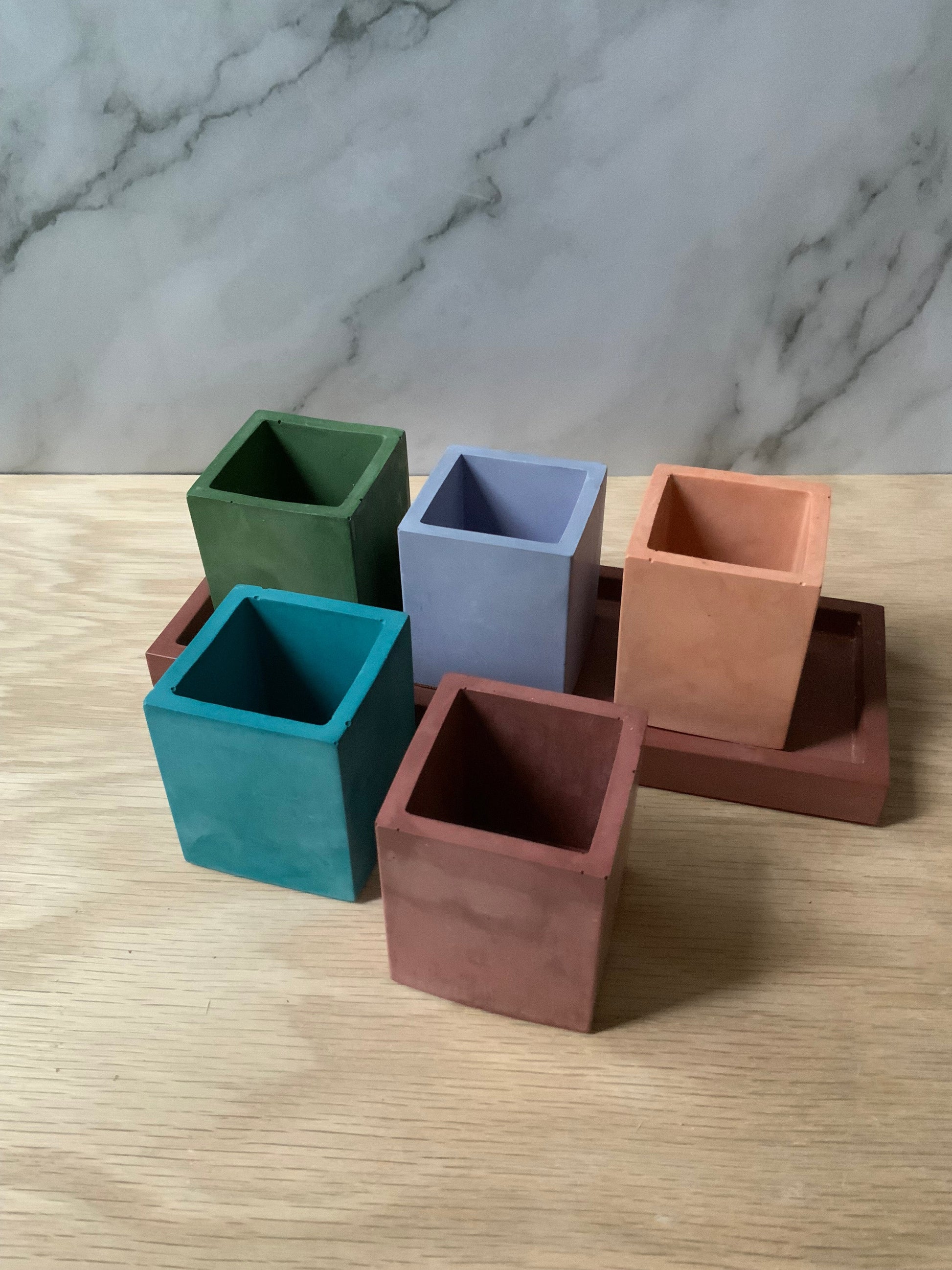 Description: This multipurpose, handmade concrete square vessel, pen pot, or storage cup can be used for toothbrushes, pens/pencils, coffee stir sticks, makeup brushes, air plants, small flowers, and much more. Pair it with our bathroom or desk accessories for a full set.