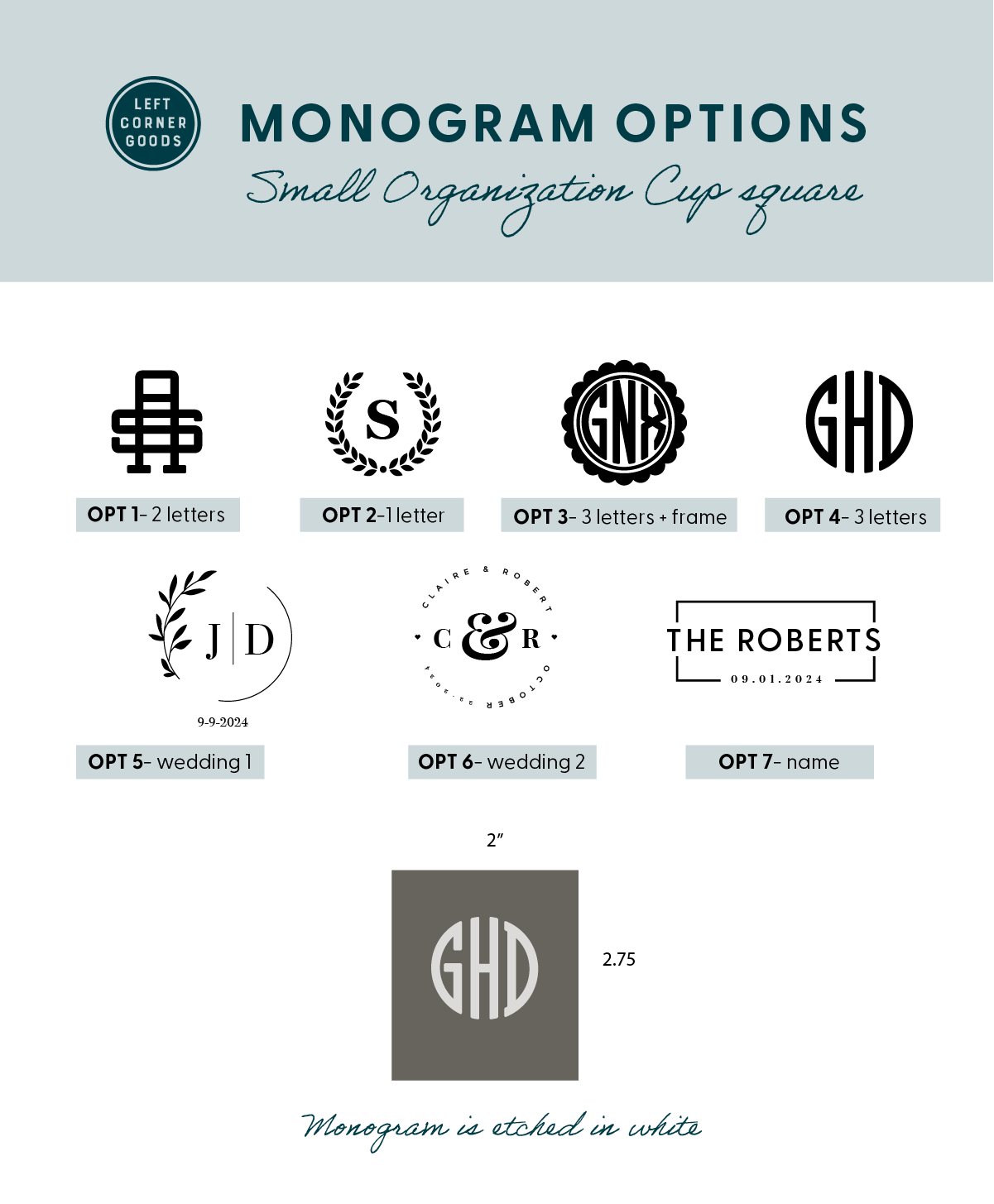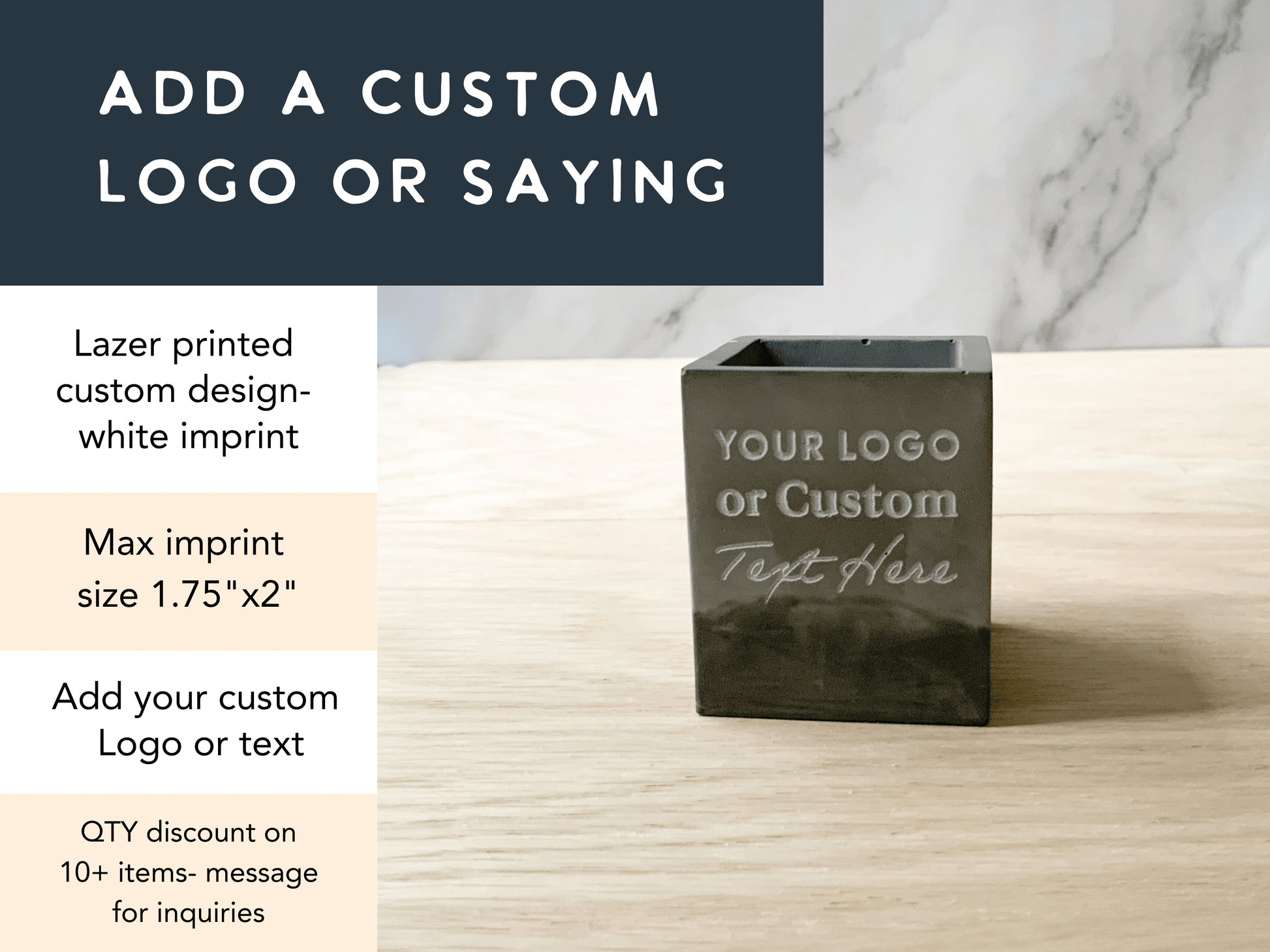 This listing includes custom text, or your logo laser etched the square cup. Please send your custom text in the notes of your order, or email your logo to holly@leftcornerdesign.com - you will receive a proof of your text or logo on your piece before production.