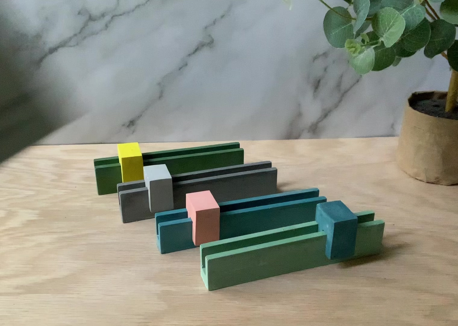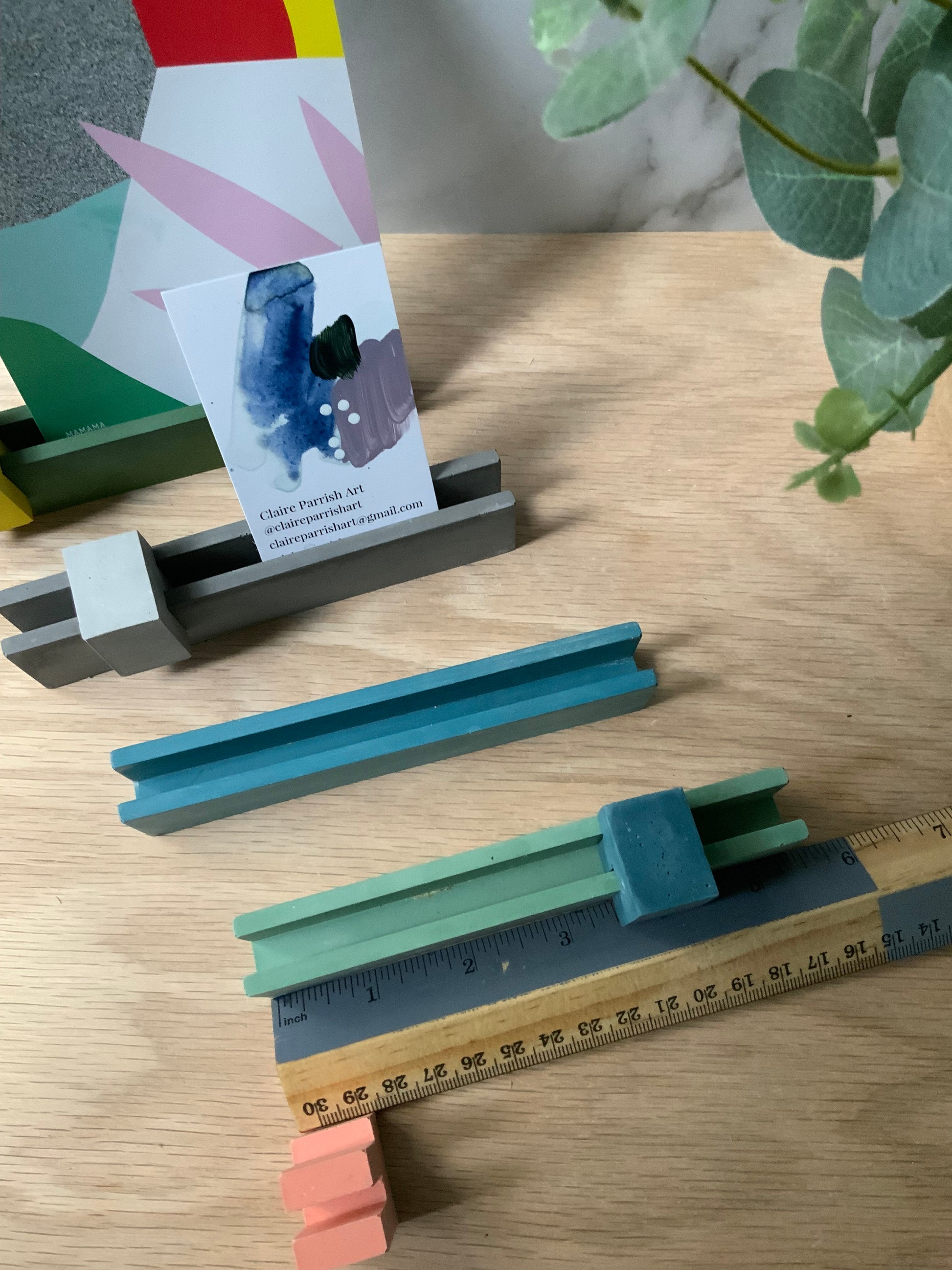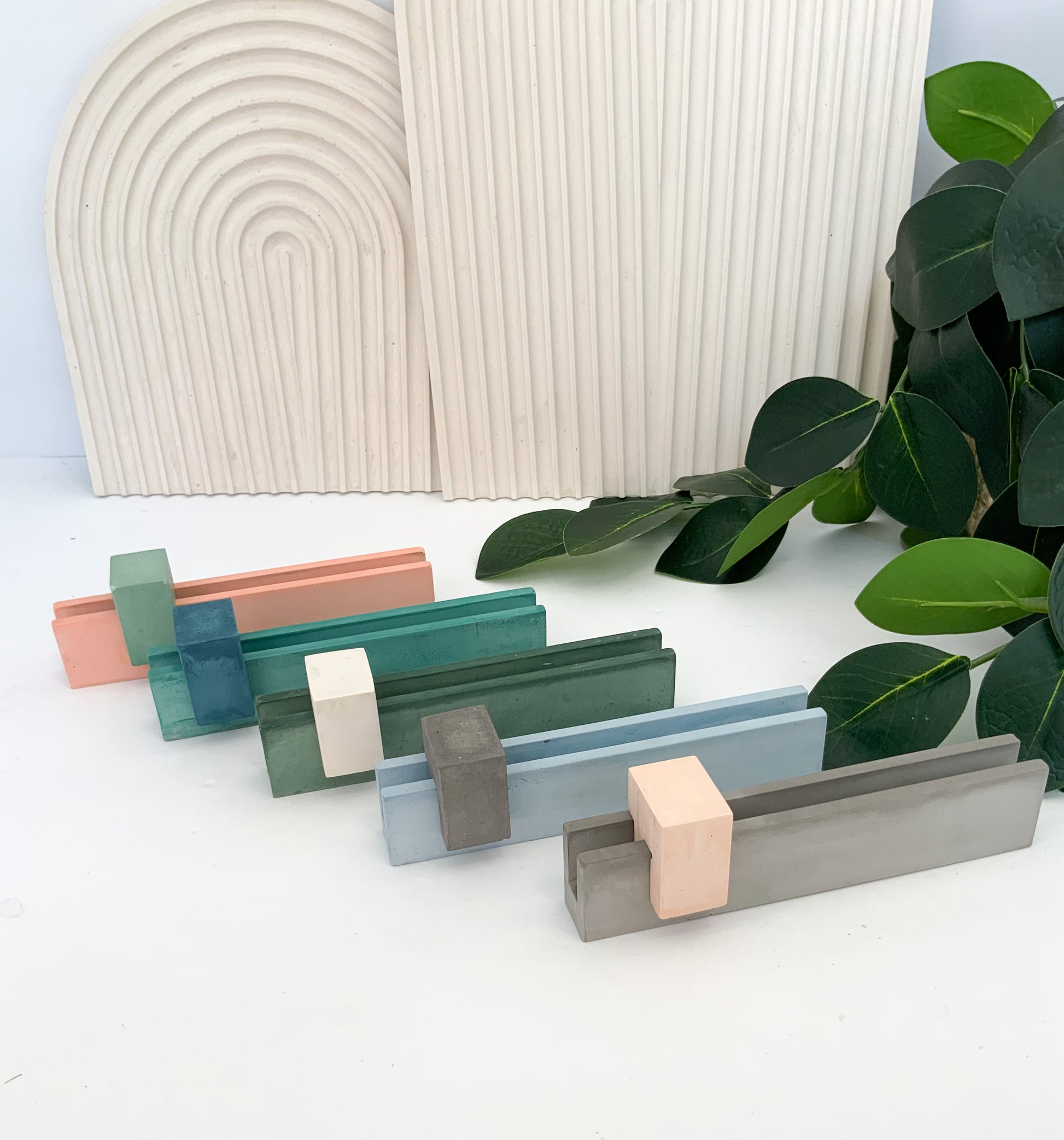 2-toned Modern concrete photo stand set. Great display for business cards, photos, brochures, small signs, Christmas cards, Menu specials etc. This is a two-piece set, you can remove the small piece and use it to display more, or leave it as a placeholder for your items in the stand.