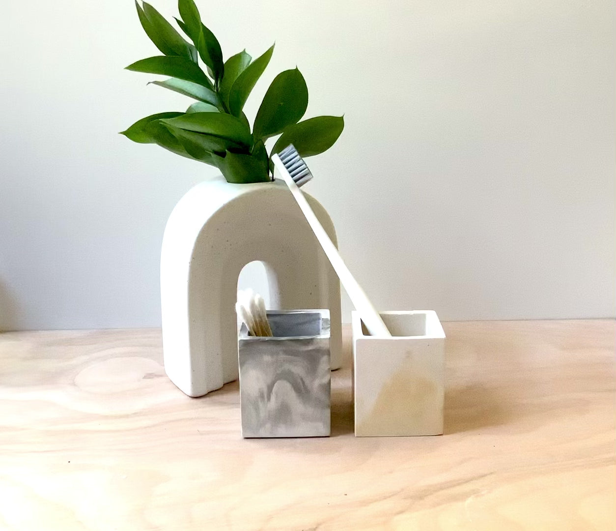 This multipurpose, handmade concrete square vessel, pen pot, or storage cup can be used for toothbrushes, pens/pencils, coffee stir sticks, makeup brushes, air plants, small flowers, and much more. Pair it with our bathroom or desk accessories for a full set.