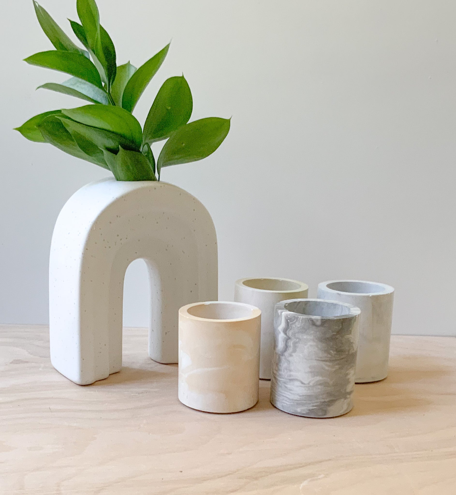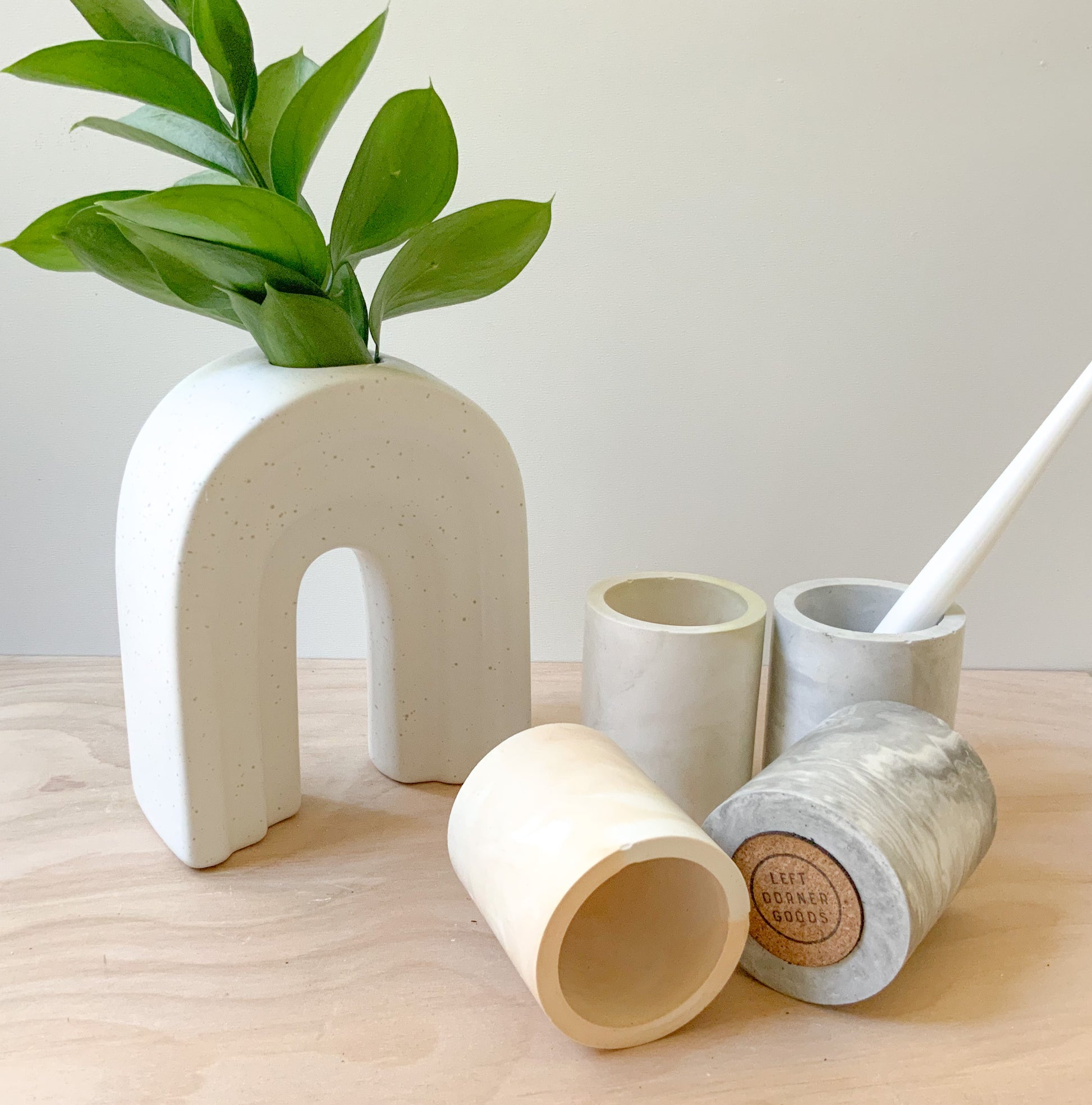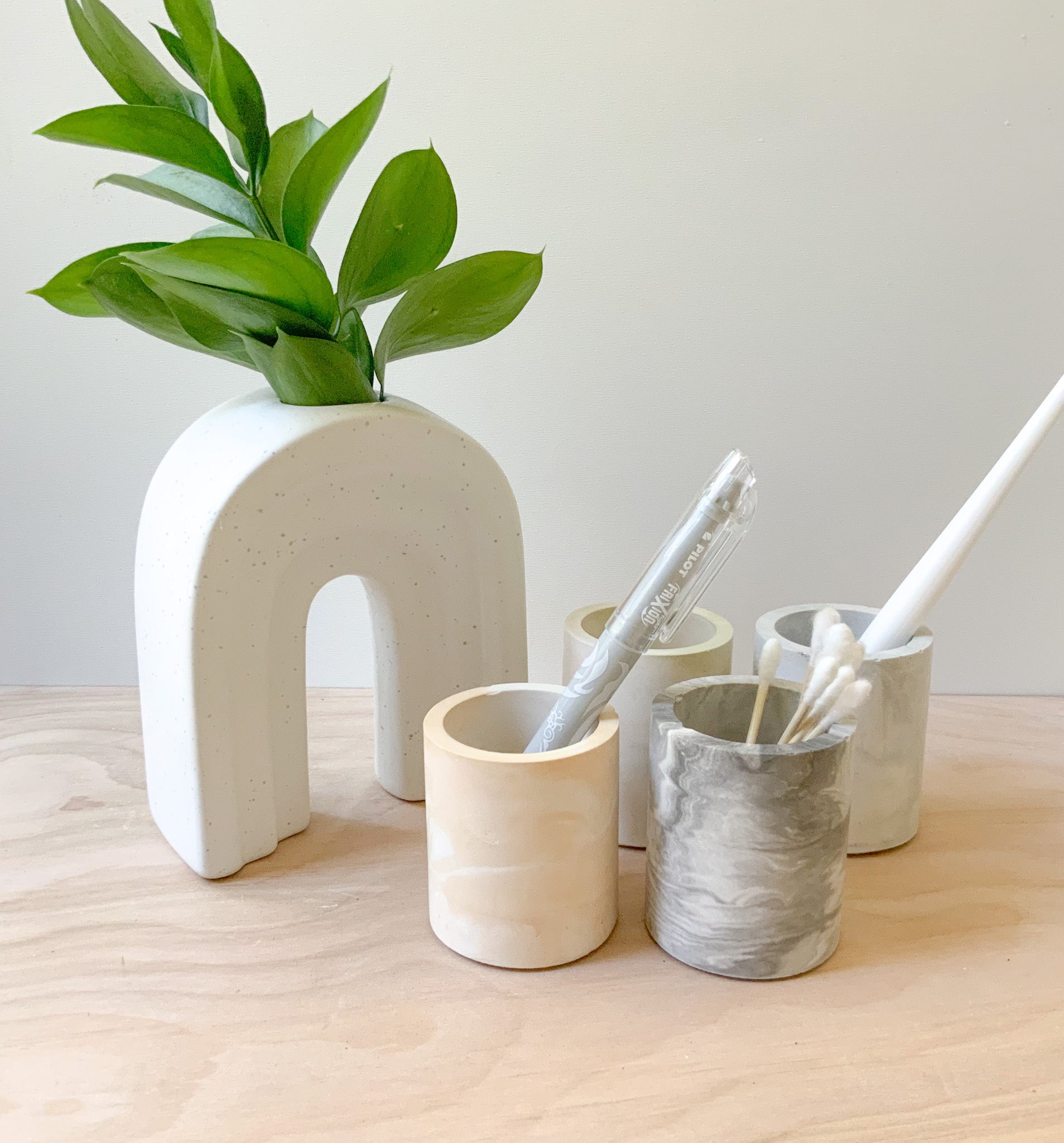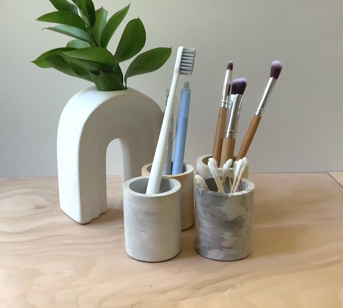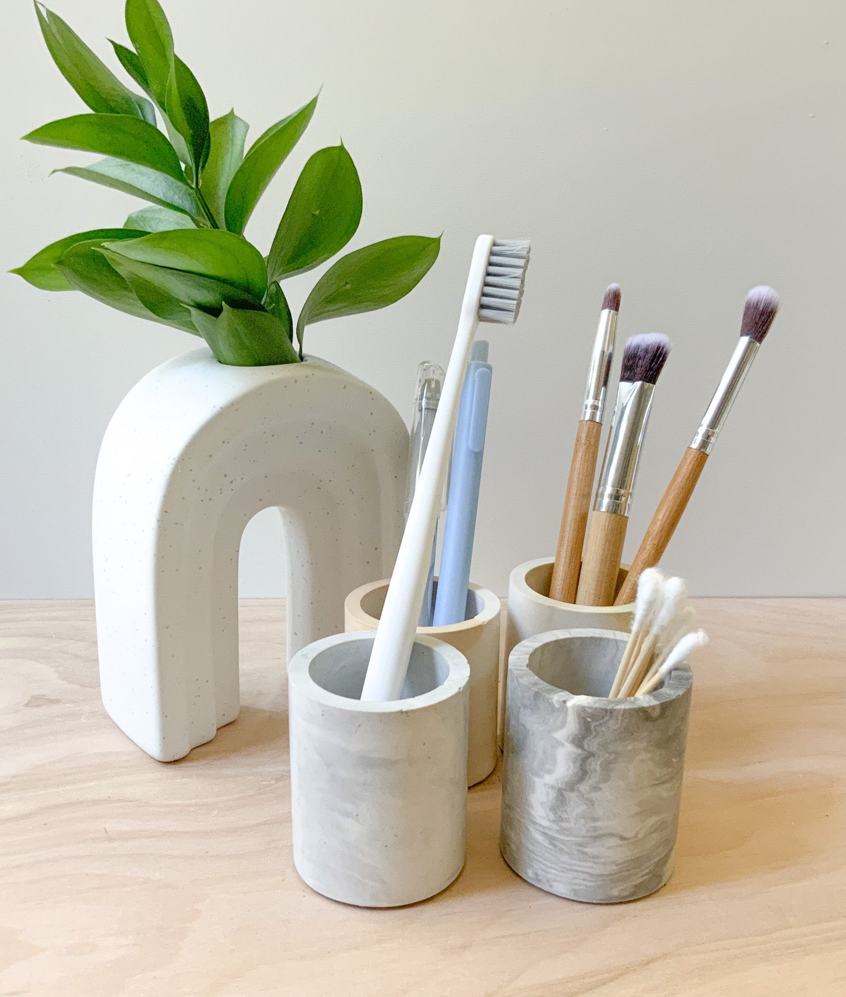 Description: This multipurpose, handmade concrete cylindrical vessel, pen pot, or storage cup can be used for toothbrushes, pens/pencils, coffee stir sticks, makeup brushes, air plants, small flowers, and much more. Pair it with our bathroom or desk accessories for a full set.