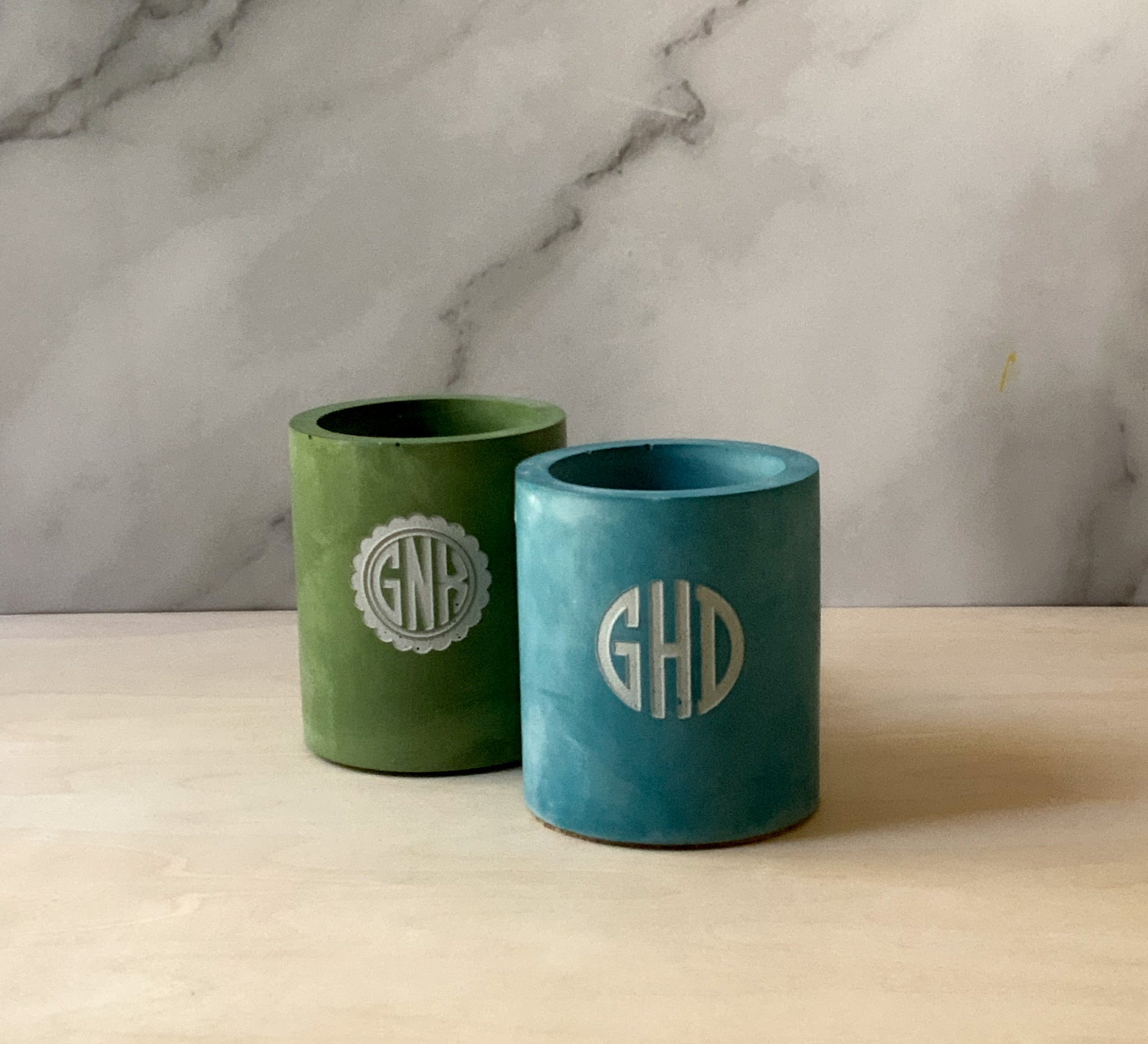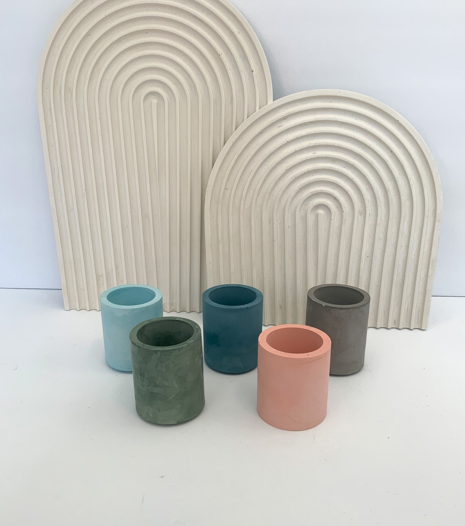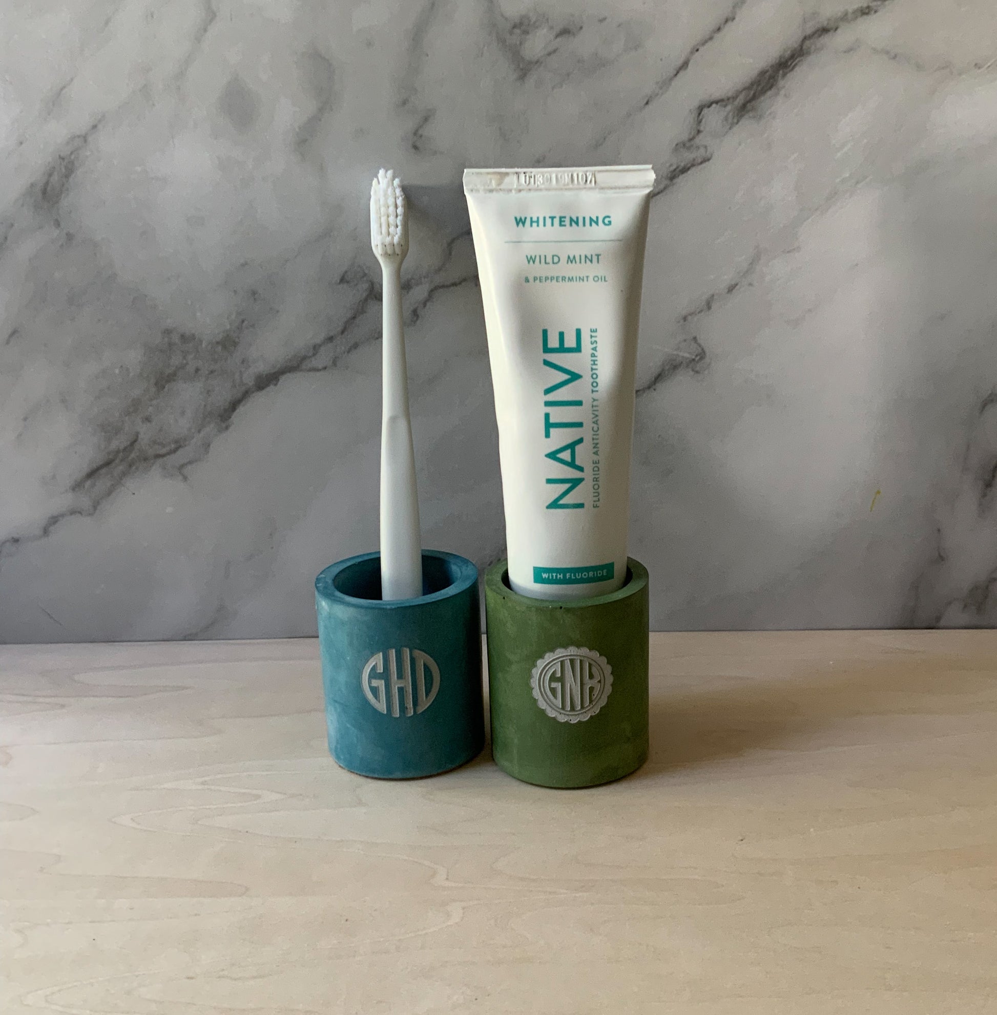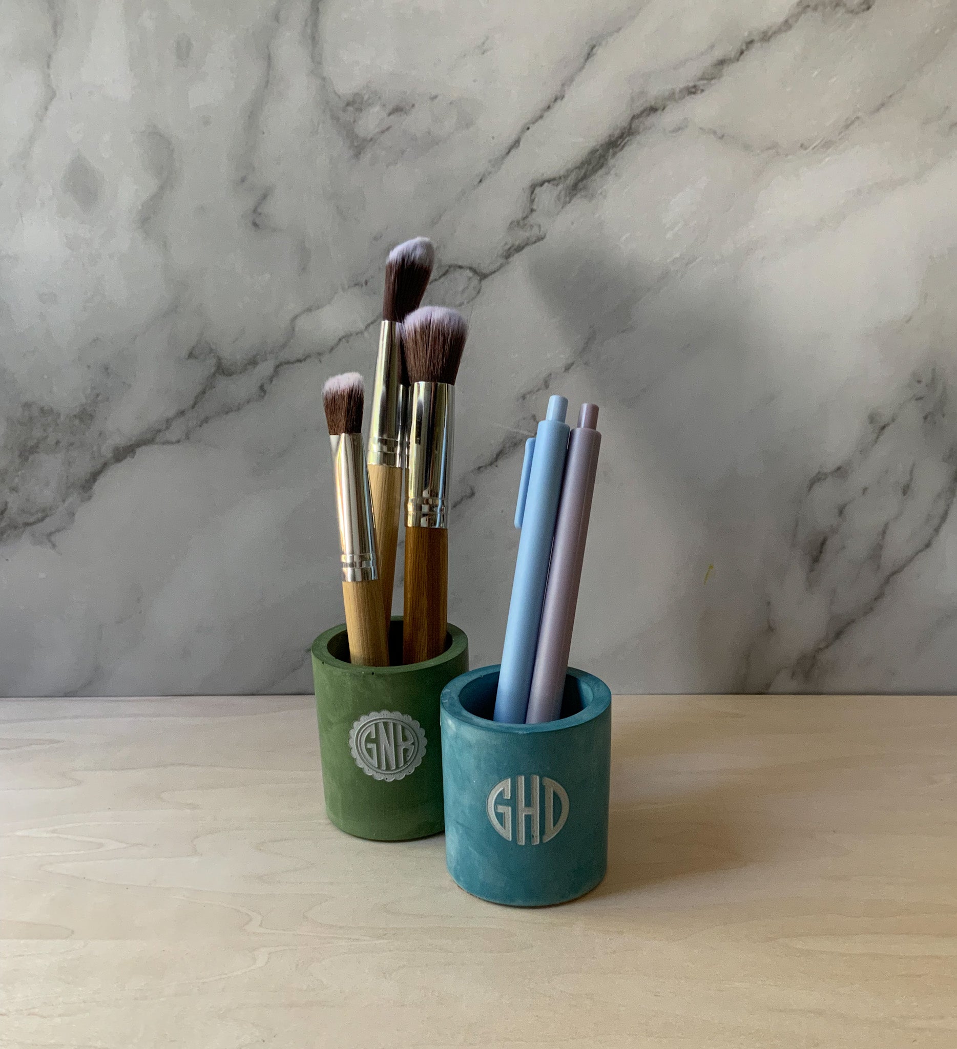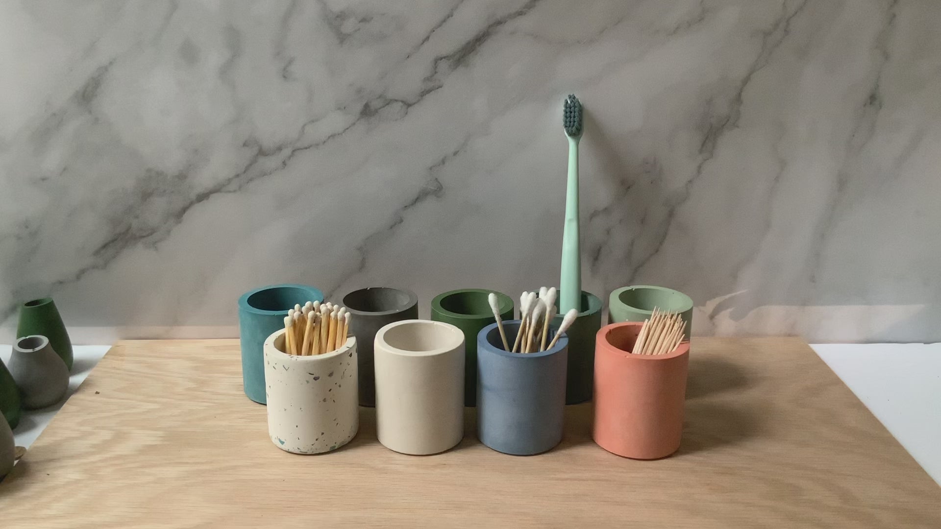 Description: This multipurpose, handmade concrete cylindrical vessel, pen pot, or storage cup can be used for toothbrushes, pens/pencils, coffee stir sticks, makeup brushes, air plants, small flowers, and much more. Pair it with our bathroom or desk accessories for a full set.