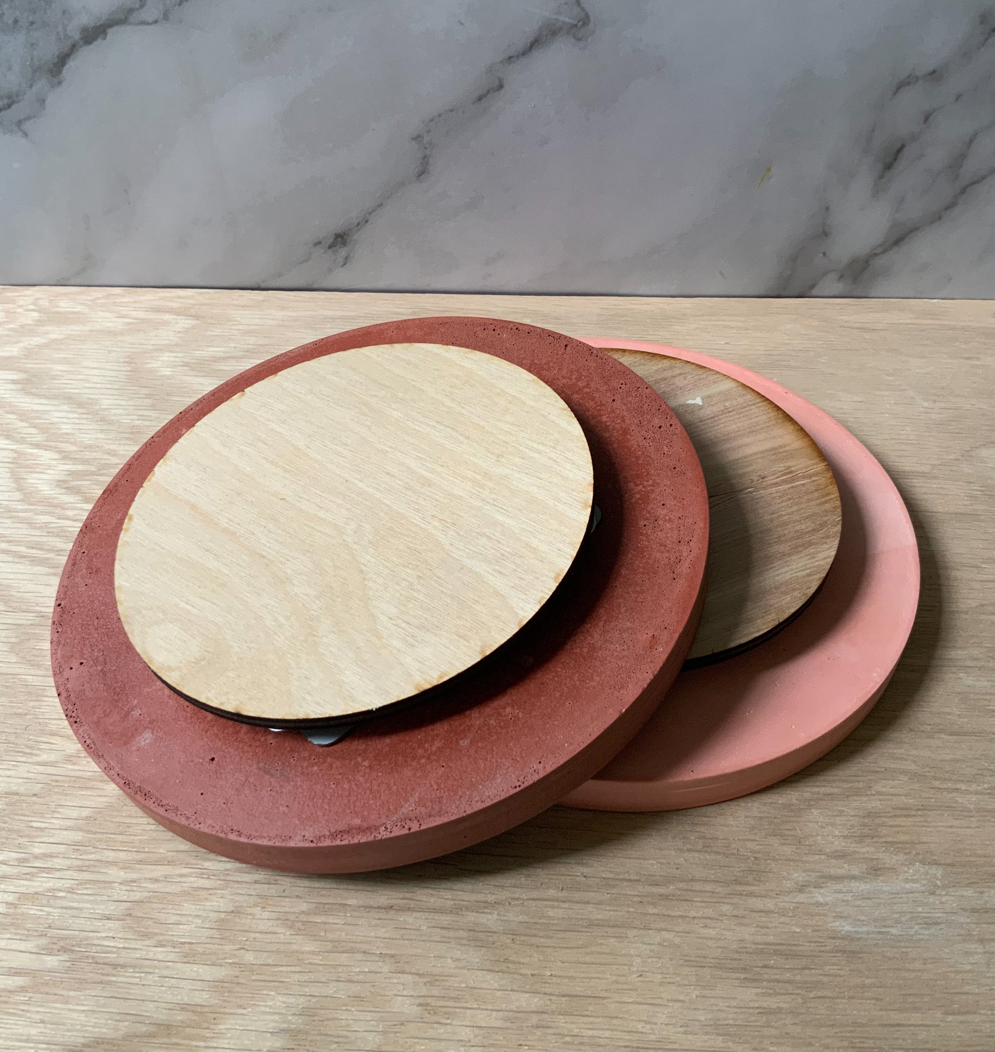 Materials: These are handmade with gypsum cement, an eco-friendly sealer. Gypsum cement is similar to Jesmonite, or eco-resin and is smooth, hard, and a strong surface with high water absorption resistance. Dry, the strength of our material is 10,000 psi in comparison to most concretes which vary from 2500-4000 psi. Imagine the durability of this stone is much like that of your favorite ceramic mug.