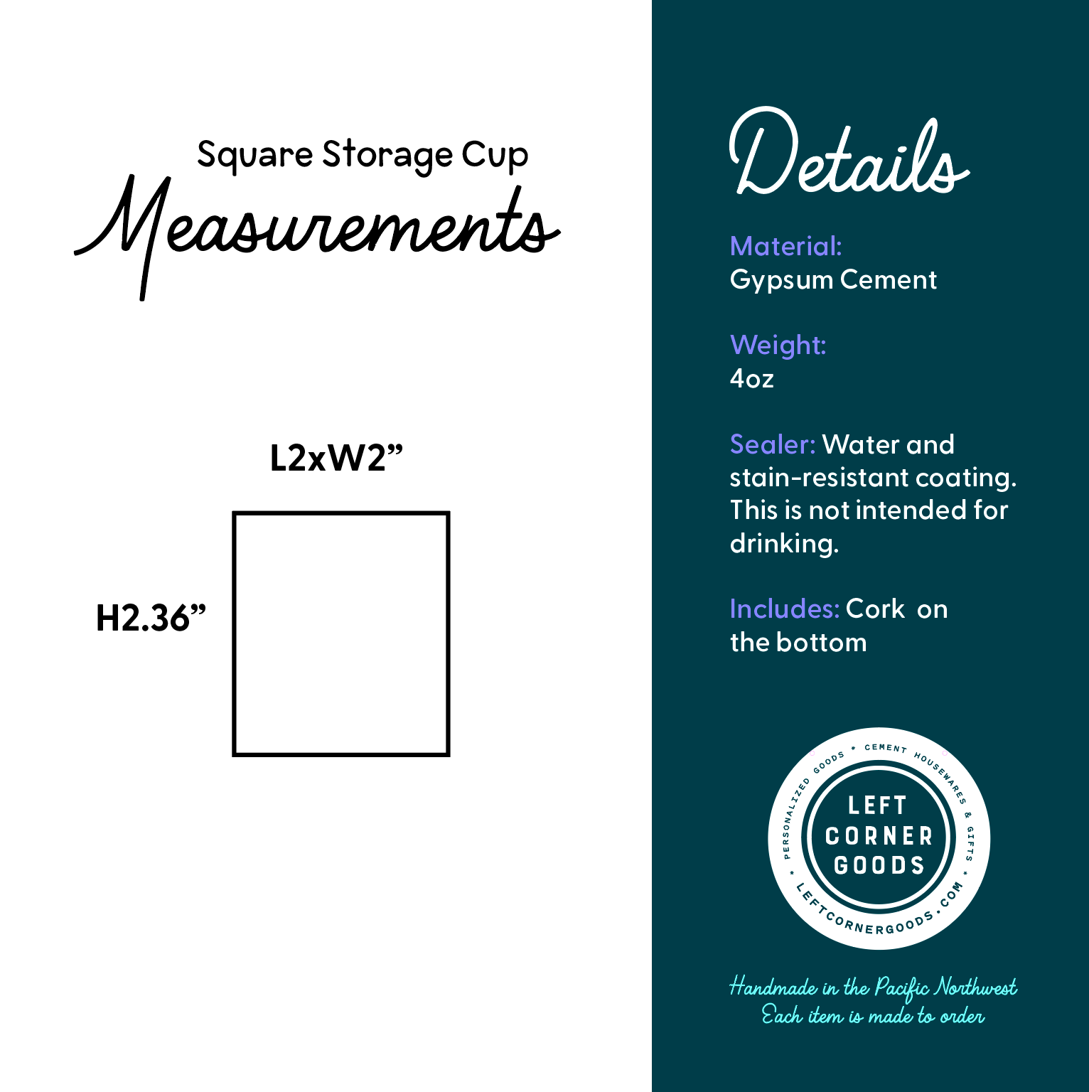 Description: This multipurpose, handmade concrete square vessel, pen pot, or storage cup can be used for toothbrushes, pens/pencils, coffee stir sticks, makeup brushes, air plants, small flowers, and much more. Pair it with our bathroom or desk accessories for a full set.